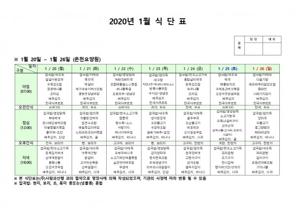 1월 셋째주 식단표 페이지 정보 작성자 은천노인복지회 작성일20-01-28 14:25 조회185,938회 댓글0건 관련링크 이전글 다음글 목록 답변 본문 1월 셋째주 식단표입니다. 이전글 다음글 목록 답변
