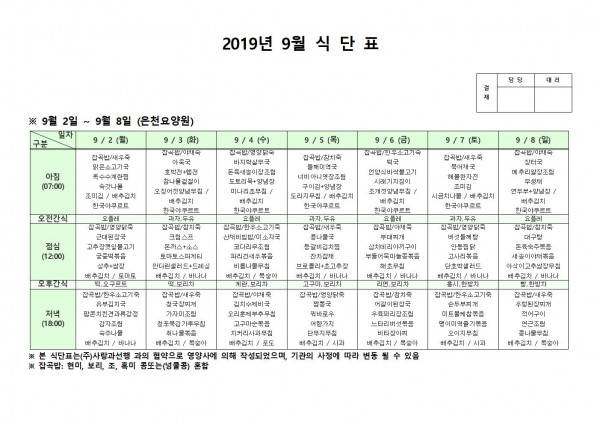 9월 첫째주 식단표 페이지 정보 작성자 은천노인복지회 작성일19-09-09 14:48 조회197,202회 댓글0건 관련링크 이전글 다음글 목록 답변 본문 9월 첫째주 식단표 이전글 다음글 목록 답변