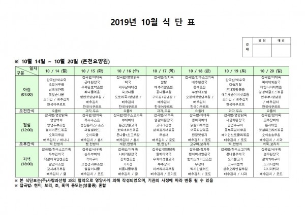 10월 셋째주 식단표 페이지 정보 작성자 은천노인복지회 작성일19-10-21 15:50 조회193,708회 댓글0건 관련링크 이전글 다음글 목록 답변 본문 10월 셋째주 식단표 이전글 다음글 목록 답변