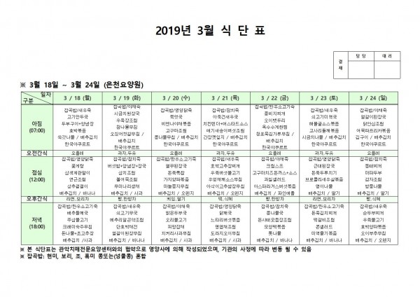 3월 셋째주 식단표 페이지 정보 작성자 은천노인복지회 작성일19-03-25 11:11 조회205,962회 댓글0건 관련링크 이전글 다음글 목록 답변 본문 3월 셋째주 식단표 이전글 다음글 목록 답변