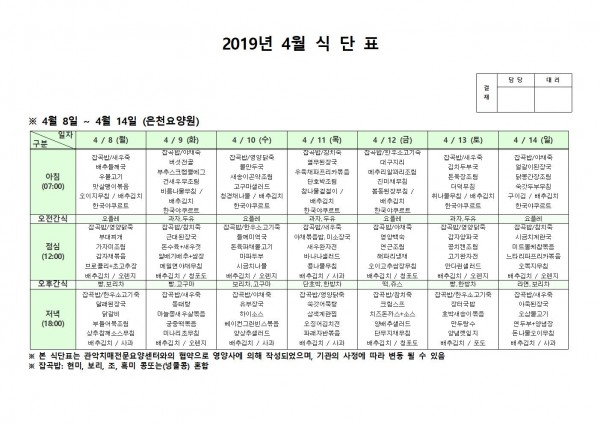 4월 둘째주 식단표 페이지 정보 작성자 은천노인복지회 작성일19-04-16 09:48 조회206,273회 댓글0건 관련링크 이전글 다음글 목록 답변 본문 4월 둘째주 식단표 이전글 다음글 목록 답변
