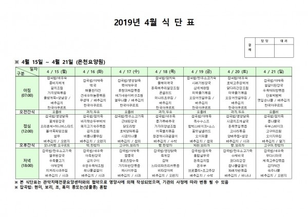 4월 셋째주 식단표 페이지 정보 작성자 은천노인복지회 작성일19-04-22 13:22 조회206,227회 댓글0건 관련링크 이전글 다음글 목록 답변 본문 4월 셋째주 식단표 이전글 다음글 목록 답변