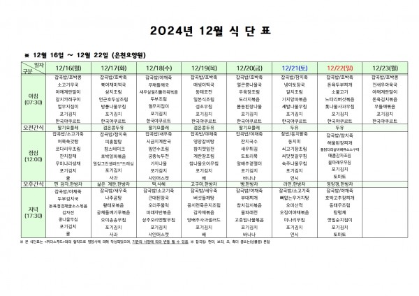 12월 셋째주 식단표 페이지 정보 작성자 은천노인복지회 작성일24-12-13 09:36 조회20,273회 댓글0건 관련링크 이전글 다음글 목록 답변 본문 . 이전글 다음글 목록 답변