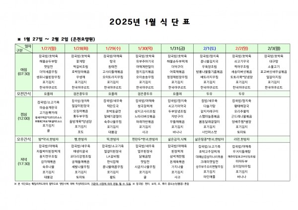1월 다섯째주 식단표 페이지 정보 작성자 은천노인복지회 작성일25-01-24 10:07 조회16,975회 댓글0건 관련링크 이전글 다음글 목록 답변 본문 . 이전글 다음글 목록 답변