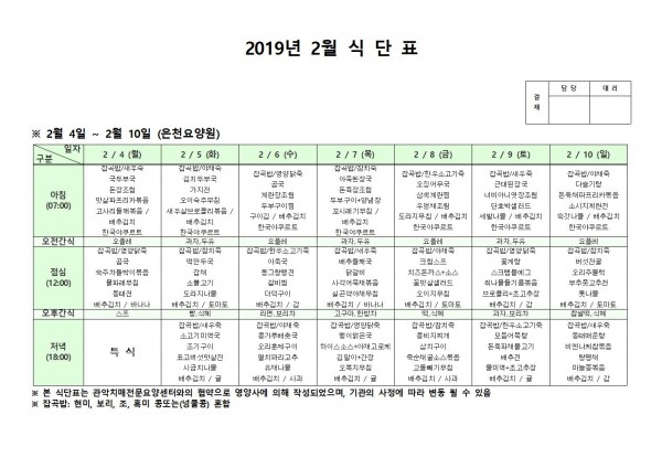 2월 첫째주 식단표 페이지 정보 작성자 은천노인복지회 작성일19-02-13 17:29 조회207,577회 댓글0건 관련링크 이전글 다음글 목록 답변 본문 2월 첫째주 식단표 이전글 다음글 목록 답변