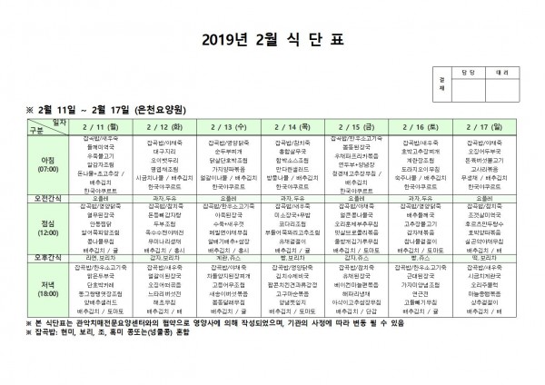 2월 둘째주 식단표 페이지 정보 작성자 은천노인복지회 작성일19-02-13 17:30 조회208,297회 댓글0건 관련링크 이전글 다음글 목록 답변 본문 2월 둘째주 식단표 이전글 다음글 목록 답변