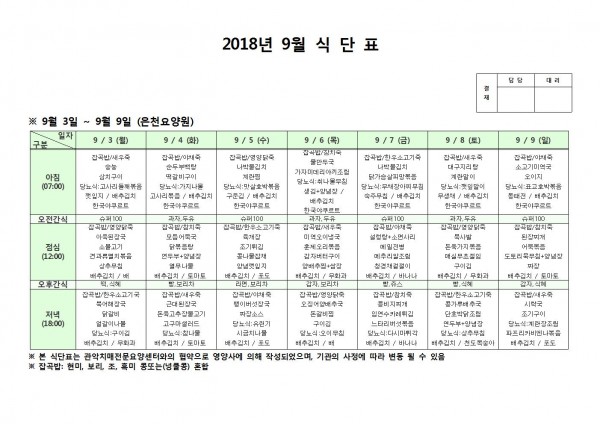 9월 첫째주 식단표 페이지 정보 작성자 은천노인복지회 작성일18-09-11 09:27 조회207,564회 댓글0건 관련링크 이전글 다음글 목록 답변 본문 9월 첫째주 식단표 이전글 다음글 목록 답변