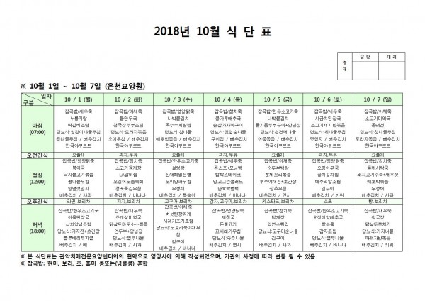 10월 첫째주 식단표 페이지 정보 작성자 은천노인복지회 작성일18-10-08 11:06 조회205,892회 댓글0건 관련링크 이전글 다음글 목록 답변 본문 10월 첫째주 식단표 이전글 다음글 목록 답변