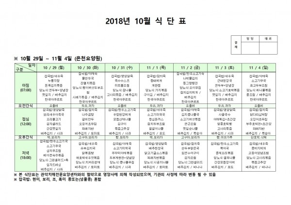 10월 5주째 식단표 페이지 정보 작성자 은천노인복지회 작성일18-12-07 09:36 조회208,127회 댓글0건 관련링크 이전글 다음글 목록 답변 본문 10월 5주째 식단표 이전글 다음글 목록 답변
