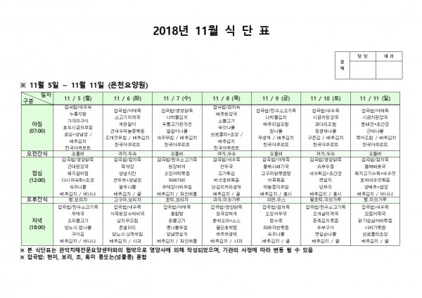 11월 1주째 식단표 페이지 정보 작성자 은천노인복지회 작성일18-12-07 09:37 조회208,837회 댓글0건 관련링크 이전글 다음글 목록 답변 본문 11월 1주째 식단표 이전글 다음글 목록 답변
