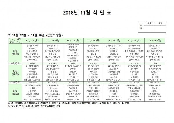 11월 2주째 식단표 페이지 정보 작성자 은천노인복지회 작성일18-12-07 09:37 조회208,639회 댓글0건 관련링크 이전글 다음글 목록 답변 본문 11월 2주째 식단표 이전글 다음글 목록 답변