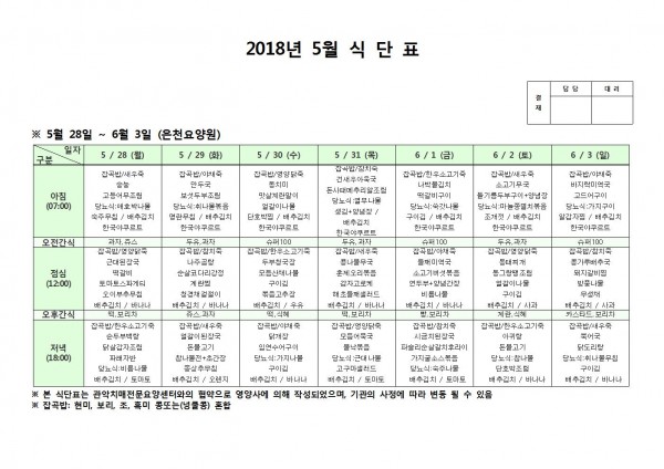 5월 다섯째주 식단표 페이지 정보 작성자 은천노인복지회 작성일18-06-07 10:39 조회207,982회 댓글0건 관련링크 이전글 다음글 목록 답변 본문 5월 다섯쨰주 식단표 이전글 다음글 목록 답변
