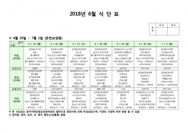 6월 다섯째주 식단표 페이지 정보 작성자 은천노인복지회 작성일18-07-09 16:45 조회212,132회 댓글0건 관련링크 이전글 다음글 목록 답변 본문 6월 다섯째주 식단표 이전글 다음글 목록 답변