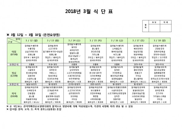 3월 셋째주 식단표 페이지 정보 작성자 은천노인복지회 작성일18-03-12 10:41 조회200,256회 댓글0건 관련링크 이전글 다음글 목록 답변 본문 3월 셋째주 식단표 이전글 다음글 목록 답변