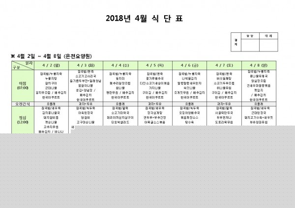 4월 첫째주 식단표 페이지 정보 작성자 은천노인복지회 작성일18-04-02 15:32 조회201,098회 댓글0건 관련링크 이전글 다음글 목록 답변 본문 4월 첫째주 식단표 이전글 다음글 목록 답변