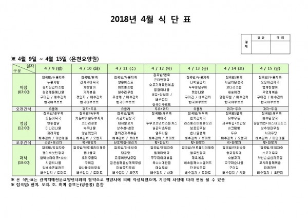 4월 둘째주 식단표 페이지 정보 작성자 은천노인복지회 작성일18-04-09 15:02 조회201,948회 댓글0건 관련링크 이전글 다음글 목록 답변 본문 4월 둘째주 식단표 이전글 다음글 목록 답변