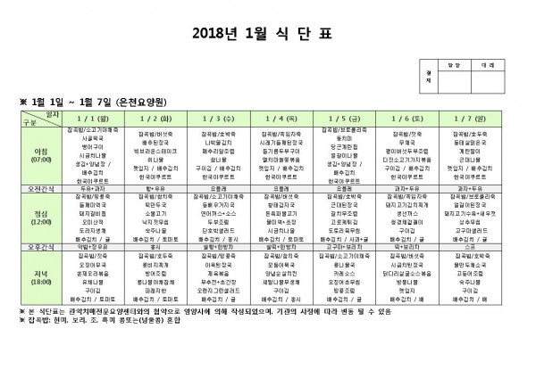 2018 1월 첫째주 식단표 페이지 정보 작성자 은천노인복지회 작성일18-01-03 11:34 조회194,302회 댓글0건 관련링크 이전글 다음글 목록 답변 본문 2018 1월 첫째주 식단표 이전글 다음글 목록 답변