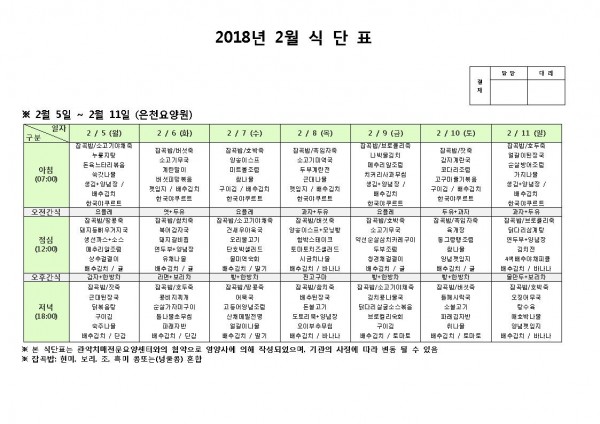 2월 첫째주 식단표 페이지 정보 작성자 은천노인복지회 작성일18-02-05 17:07 조회197,182회 댓글0건 관련링크 이전글 다음글 목록 답변 본문 2월 첫째주 식단표 이전글 다음글 목록 답변