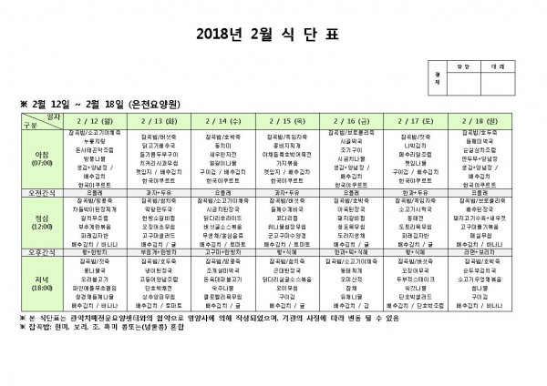 2월 둘째주 식단표 페이지 정보 작성자 은천노인복지회 작성일18-02-12 11:15 조회196,588회 댓글0건 관련링크 이전글 다음글 목록 답변 본문 2월 둘째주 식단표 이전글 다음글 목록 답변