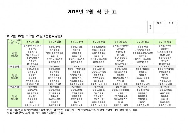 2월 셋째주 식단표 페이지 정보 작성자 은천노인복지회 작성일18-02-19 10:50 조회197,291회 댓글0건 관련링크 이전글 다음글 목록 답변 본문 2월 셋째주 식단표 이전글 다음글 목록 답변