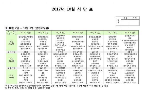 10월 첫째주 식단표 페이지 정보 작성자 은천노인복지회 작성일17-10-11 10:52 조회184,964회 댓글0건 관련링크 이전글 다음글 목록 답변 본문 10월 첫째주 식단표 이전글 다음글 목록 답변