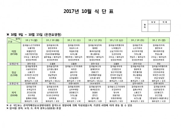 10월 둘째주 식단표 페이지 정보 작성자 은천노인복지회 작성일17-10-17 17:39 조회186,321회 댓글0건 관련링크 이전글 다음글 목록 답변 본문 10월 둘째주 식단표 이전글 다음글 목록 답변