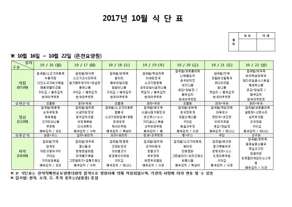 10월 셋째주 식단표 페이지 정보 작성자 은천노인복지회 작성일17-10-17 17:39 조회186,055회 댓글0건 관련링크 이전글 다음글 목록 답변 본문 10월 셋째주 식단표 이전글 다음글 목록 답변