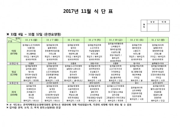 11월 둘째주 식단표 페이지 정보 작성자 은천노인복지회 작성일17-11-09 10:44 조회187,233회 댓글0건 관련링크 이전글 다음글 목록 답변 본문 11월 둘째주 식단표 이전글 다음글 목록 답변