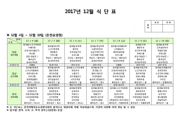 12월 둘째주 식단표 페이지 정보 작성자 은천노인복지회 작성일17-12-04 13:47 조회190,523회 댓글0건 관련링크 이전글 다음글 목록 답변 본문 12월 둘째주 식단표 이전글 다음글 목록 답변