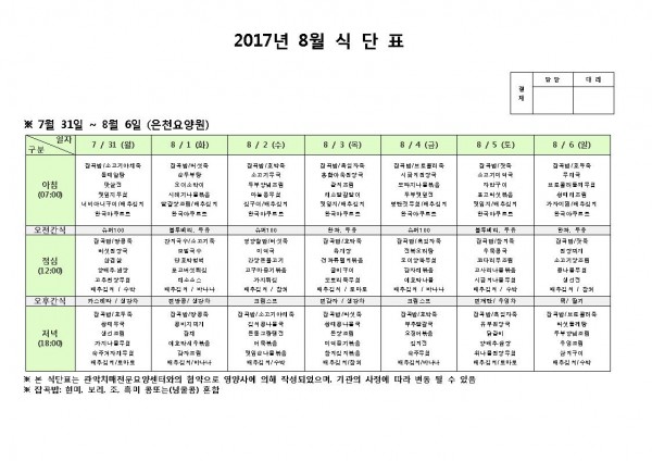 8월 첫째주 식단표 페이지 정보 작성자 은천노인복지회 작성일17-08-01 13:43 조회182,873회 댓글0건 관련링크 이전글 다음글 목록 답변 본문 8월 첫째주 식단표 이전글 다음글 목록 답변