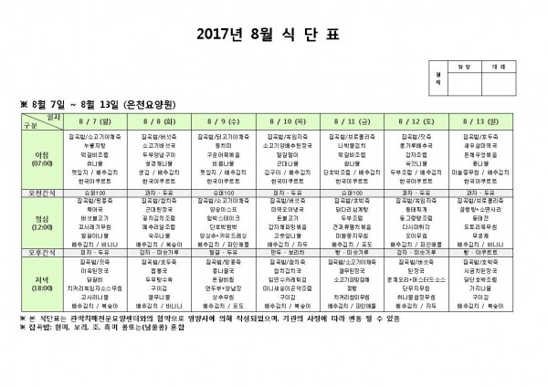 8월 둘째주 식단표 페이지 정보 작성자 은천노인복지회 작성일17-08-07 09:46 조회182,952회 댓글0건 관련링크 이전글 다음글 목록 답변 본문 8월 둘째주 식단표 이전글 다음글 목록 답변