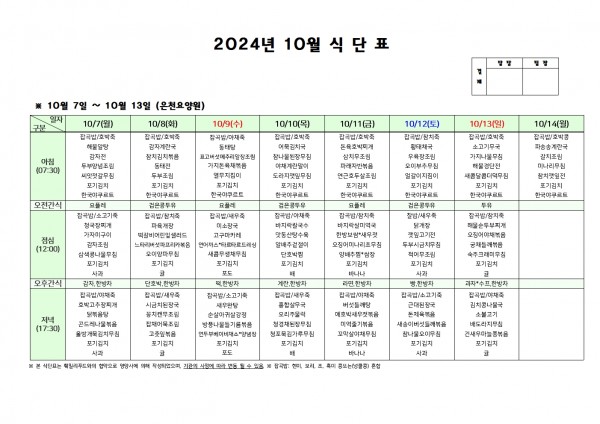 10월 둘째주 식단표 페이지 정보 작성자 은천노인복지회 작성일24-10-04 11:48 조회22,647회 댓글0건 관련링크 이전글 다음글 목록 답변 본문 . 이전글 다음글 목록 답변