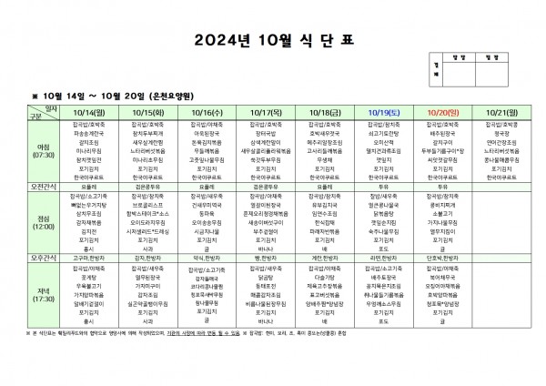 10월 셋째주 식단표 페이지 정보 작성자 은천노인복지회 작성일24-10-11 16:45 조회22,433회 댓글0건 관련링크 이전글 다음글 목록 답변 본문 . 이전글 다음글 목록 답변