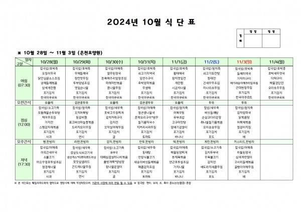 10월 다섯째 주 식단표 페이지 정보 작성자 은천노인복지회 작성일24-10-24 15:18 조회21,890회 댓글0건 관련링크 이전글 다음글 목록 답변 본문 . 이전글 다음글 목록 답변