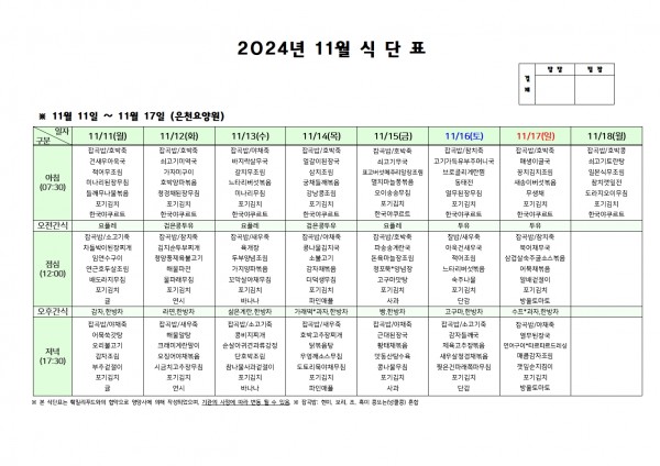 11월 둘째주 식단표 페이지 정보 작성자 은천노인복지회 작성일24-11-07 16:50 조회21,828회 댓글0건 관련링크 이전글 다음글 목록 답변 본문 . 이전글 다음글 목록 답변