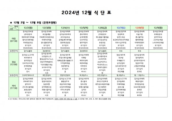 12월 첫째주 식단표 페이지 정보 작성자 은천노인복지회 작성일24-11-29 16:53 조회21,056회 댓글0건 관련링크 이전글 다음글 목록 답변 본문 . 이전글 다음글 목록 답변