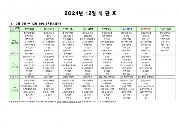 12월 둘째주 식단표 페이지 정보 작성자 은천노인복지회 작성일24-12-06 09:42 조회20,990회 댓글0건 관련링크 이전글 다음글 목록 답변 본문 . 이전글 다음글 목록 답변