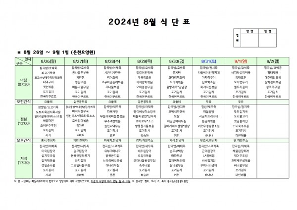 8월 다섯째주 식단표 페이지 정보 작성자 은천노인복지회 작성일24-08-23 11:34 조회24,618회 댓글0건 관련링크 이전글 다음글 목록 답변 본문 . 이전글 다음글 목록 답변