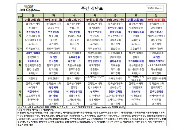 4월 셋째주 식단표 페이지 정보 작성자 은천노인복지회 작성일26-04-16 17:43 조회48회 댓글0건 관련링크 다음글 목록 답변 본문 4월 셋째주 어르신 식단표 안내해 드립니다. 정성과 영양을 담아 준비하겠습니다. 다음글 목록 답변