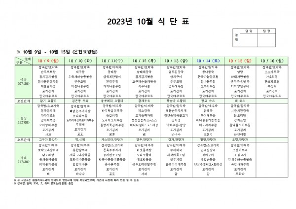 10월 둘째주 식단표 페이지 정보 작성자 은천노인복지회 작성일23-10-05 17:41 조회39,651회 댓글0건 관련링크 이전글 다음글 목록 답변 본문 . 이전글 다음글 목록 답변