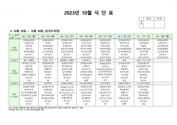 10월 넷째주 식단표 페이지 정보 작성자 은천노인복지회 작성일23-10-19 16:41 조회39,593회 댓글0건 관련링크 이전글 다음글 목록 답변 본문 . 이전글 다음글 목록 답변