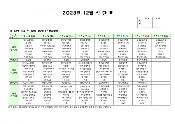 12월 둘째주 식단표 페이지 정보 작성자 은천노인복지회 작성일23-12-01 16:35 조회35,022회 댓글0건 관련링크 이전글 다음글 목록 답변 본문 . 이전글 다음글 목록 답변