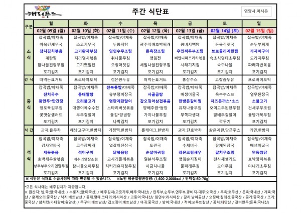 2월 둘째주 식단표 페이지 정보 작성자 은천노인복지회 작성일26-02-06 11:17 조회4,231회 댓글0건 관련링크 이전글 다음글 목록 답변 본문 2월 둘째주 어르신 식단표 안내해 드립니다. 정성과 영양을 담아 준비하겠습니다. 이전글 다음글 목록 답변