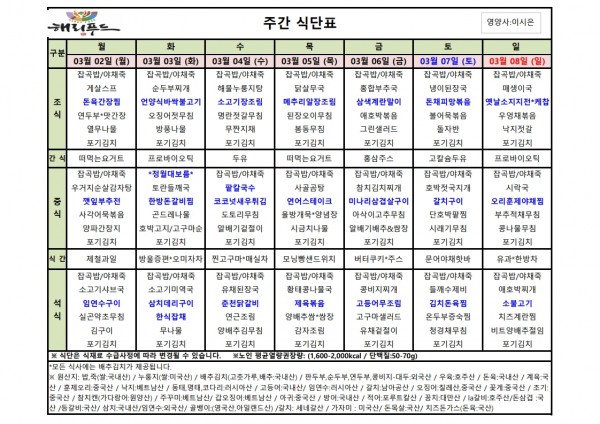 3월 첫째주 식단표 페이지 정보 작성자 은천노인복지회 작성일26-02-27 13:13 조회2,623회 댓글0건 관련링크 이전글 다음글 목록 답변 본문 2월 넷째주 어르신 식단표 안내해 드립니다. 정성과 영양을 담아 준비하겠습니다. 이전글 다음글 목록 답변