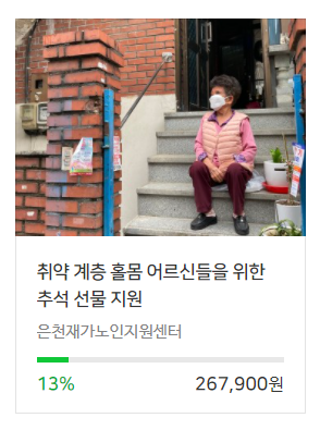 취약계층 어르신을 위한 추석선물 모금활동 페이지 정보 작성자 은천노인복지회 작성일21-08-23 10:22 조회30,145회 댓글0건 관련링크 https://happybean.naver.com/donations/H000000178857 22049회 연결 목록 본문 취약계층 어르신의 추석선물 지원을 위해 해피빈에서 모금활동을 하고 있습니다~ 모금활동에 많은 동참을 부탁드립니다~ 목록