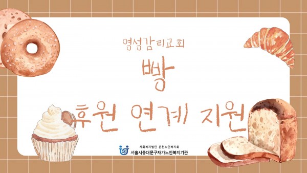 [재가노인지원서비스] 2026년 3월 영성감리교회(빵) 후원 페이지 정보 작성자 은천노인복지회 작성일26-04-06 11:18 조회17회 댓글0건 관련링크 이전글 다음글 목록 답변 본문 기관 인근에 위치한 '영성감리교회'에서 빵(단팥, 소보로, 완두앙금) 200개를 후원해주셨습니다. 이전글 다음글 목록 답변