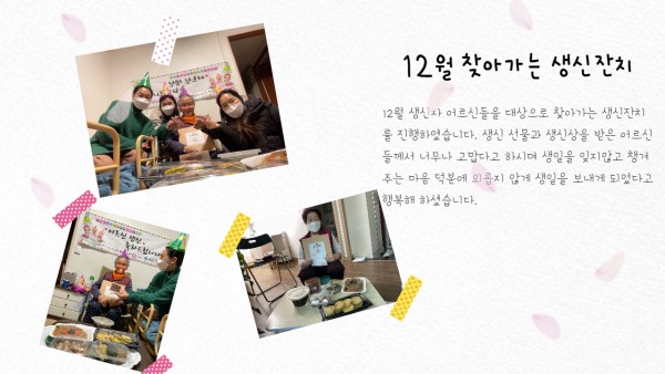[재가노인지원서비스 ] 12월 찾아가는 생신잔치 페이지 정보 작성자 은천노인복지회 작성일21-12-31 13:32 조회20,592회 댓글0건 관련링크 이전글 다음글 목록 답변 본문 12월 찾아가는 생신잔치 이전글 다음글 목록 답변