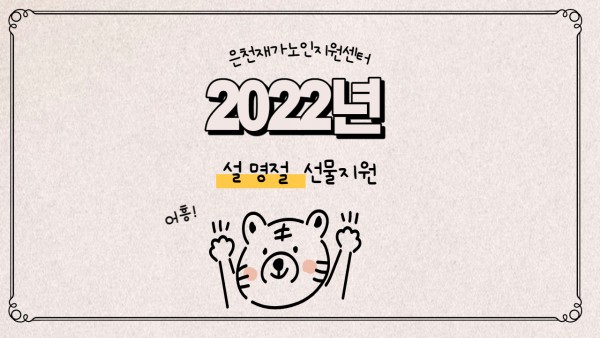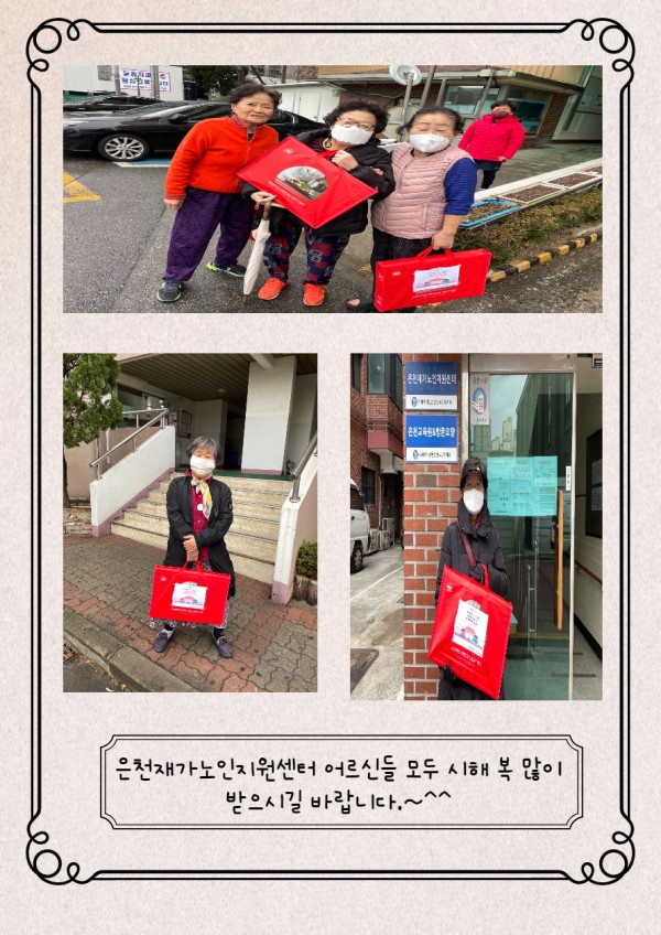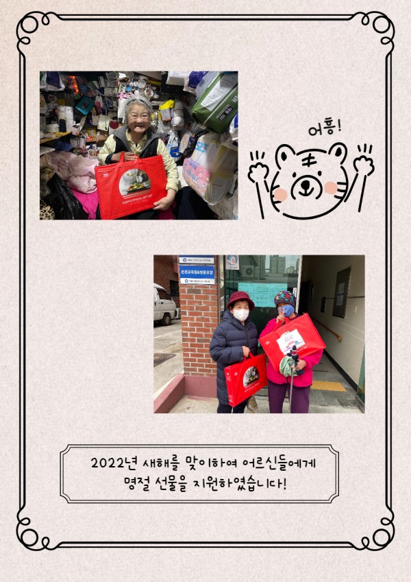 [재가노인지원서비스] 2022년 명절(설) 선물지원 페이지 정보 작성자 은천노인복지회 작성일22-02-07 15:21 조회19,998회 댓글0건 관련링크 이전글 다음글 목록 답변 본문 2022년 새해를 맞이하여 어르신들에게 선물을 지원하였습니다. 이전글 다음글 목록 답변